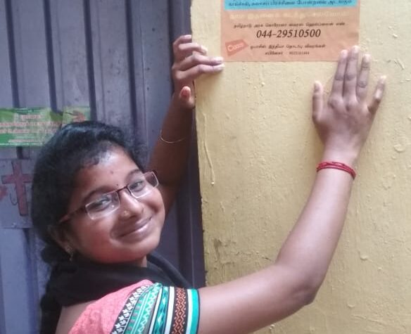 She was actively involved in our COVID-19 awareness initiative. During our door to door campaign before the lockdown, Gowri helped in educating the community members on the symptoms of COVID and on how to protect themselves from the virus. She also helped us in putting up awareness posters in the community. During the lockdown, when our staffs were unable to go to the hub, Gowri volunteered to